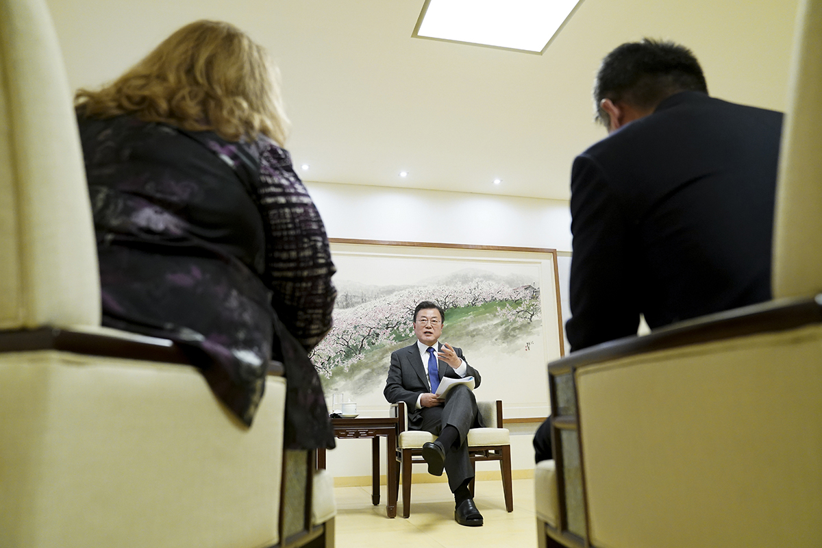 미국 국무부는 21일(현지시간) 문재인 대통령이 미국에 조속한 북미대화 재개와 점진적·단계적 비핵화 해법을 제시한 것과 관련해 동맹을 비롯한 다양한 의견을 듣고 대북정책을 주도해나갈 것이라고 밝혔다. 문 대통령이 지난 19일 청와대 상춘재에서 뉴욕타임스(NYT)와 인터뷰를 하는 모습. [헤럴드DB] |