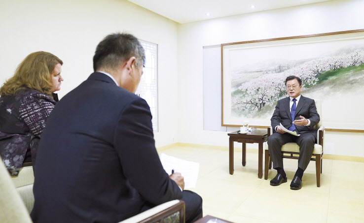 문재인 대통령이 지난 16일 청와대 상춘재에서 뉴욕타임스(NYT)와 인터뷰하고 있는 장면이 22일 공개됐다. 문재인 대통령은 전날 보도된 NYT와의 인터뷰에서 “트럼프 행정부가 거둔 성과의 토대 위에서 조 바이든 미국 행정부가 (협상을) 더욱 진전시켜나간다면 그 결실을 거둘 수 있다고 생각한다”며 조 바이든 정부가 북미 싱가포르 합의를 폐기한다면 ‘큰 실수’가 될 수 있다고 경고했다. [연합] |