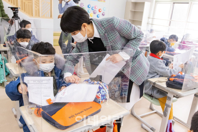 지난달 2일 오전 서울시 강남구 포이초등학교에서 첫 등교를 한 1학년 학생들이 담임교사로 부터 알림장을 받고 있다.(사진=뉴시스) |