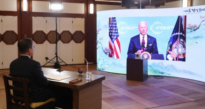 [서울=뉴시스]박영태 기자 = 문재인 대통령이 22일 청와대 상춘재에서 화상으로 열린 기후정상회의에 참석해 조 바이든 미국 대통령의 모두발언을 듣고 있다. 2021.04.22. since1999@newsis.com |