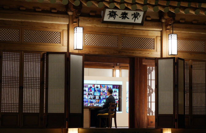 문재인 대통령이 22일 청와대 상춘재에서 화상으로 열린 기후정상회의에 참석해 있다. (사진=연합뉴스) |