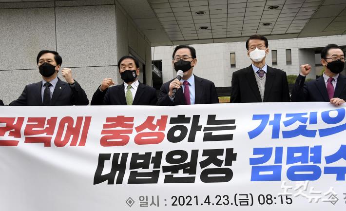 주호영 국민의힘 당대표 권한대행이 23일 오전 서울 서초구 대법원 앞에서 열린 ‘김명수 대법원장 사퇴촉구 공동선언’에 참석 발언을 하고 있다.