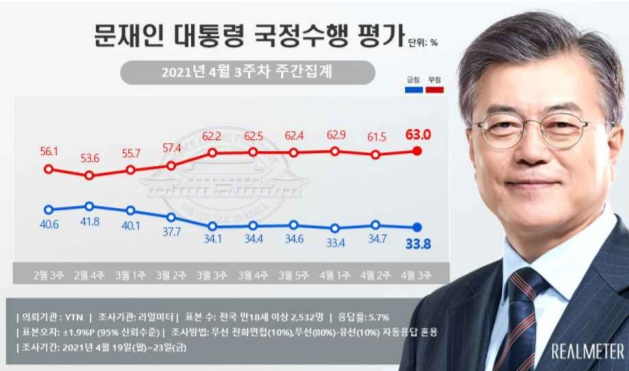 리얼미터가 YTN 의뢰로 이달 19~23일 전국 18세 이상 2532명을 대상으로 조사한 결과 문 대통령의 국정수행 긍정평가는 전주 대비 0.9%포인트(p) 내린 33.8%(매우 잘함 17.4%, 잘하는 편 16.4%)로 조사됐다.