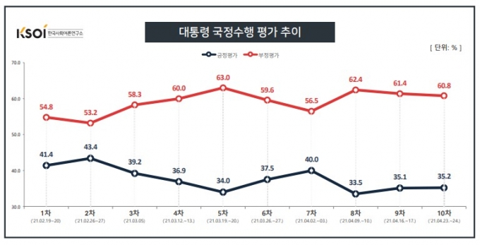 한국사회여론연구소(KSOI)가 TBS 의뢰로 지난 23~24일 이틀간 전국 성인남녀 1010명을 대상으로 문 대통령의 국정수행 평가를 조사한 결과, '잘 하고 있다'는 긍정평가는 35.1%로 나타났다.