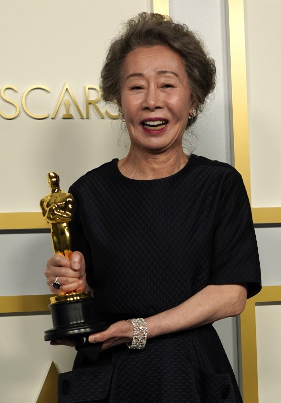 [로스앤젤레스=AP/뉴시스]배우 윤여정이 25일(현지시간) 미 캘리포니아주 로스앤젤레스의 돌비 극장에서 열린 제93회 미국 아카데미 시상식에서 영화 '미나리'로 최우수 여우 조연상을 받고 기자실에서 포즈를 취하고 있다. 2021.04.26. /사진=뉴시스 |