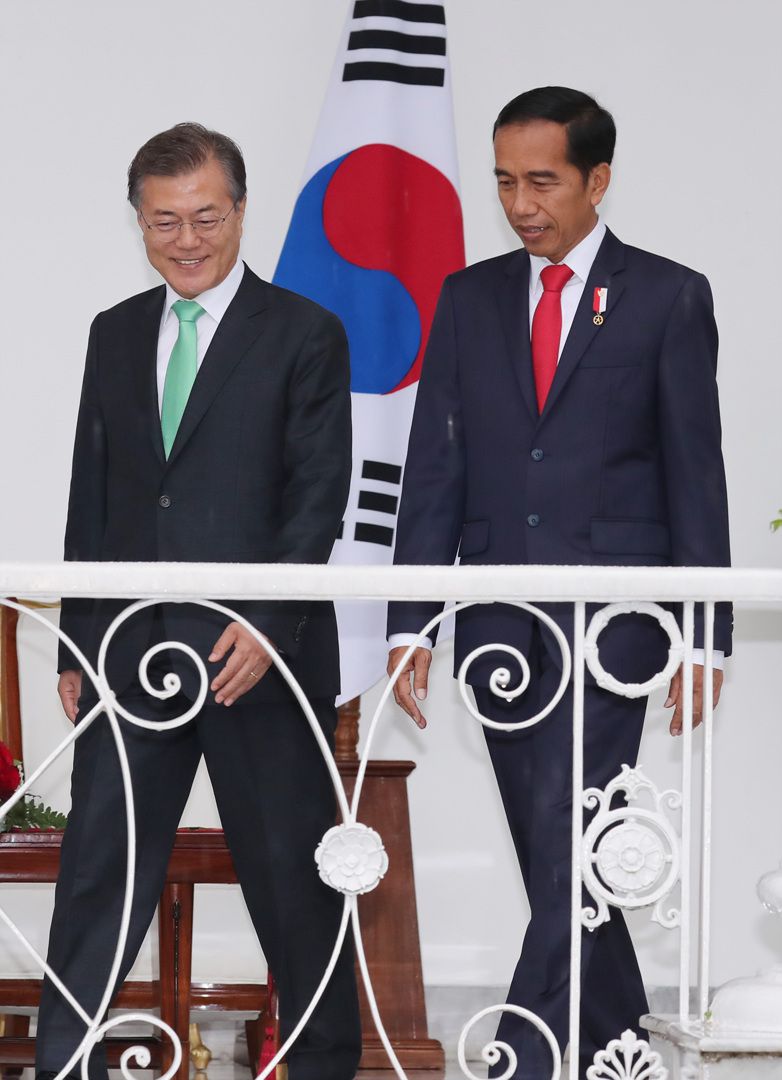 문재인 대통령이 2017년 11월 인도네시아를 국빈 방문해 대통령궁에서 조코 위도도 대통령과 대화를 나누는 모습. /청와대 |