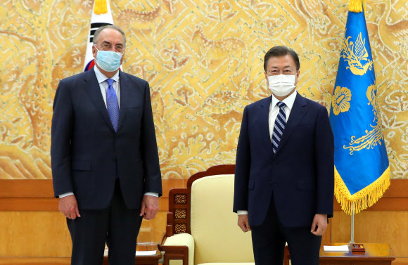 문재인 대통령은 27일 오후 청와대에서 방한 중인 노바백스의 스탠리 어크 최고경영자(CEO)를 만나 “사용 허가 절차가 신속하게 이뤄지길 바란다”고 말했다.