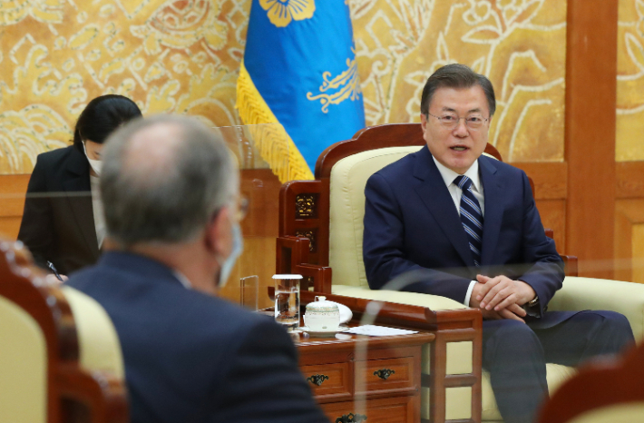 문재인 대통령이 27일 오후 청와대 본관에서 스탠리 어크 노바백스 최고경영자(CEO)를 접견하고 있다. 연합뉴스 |