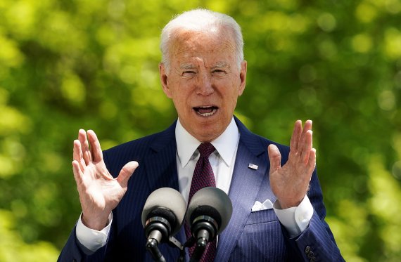 조 바이든 미국 대통령이 27일(현지시간) 백악관 야외에서 기자회견을 하고 있다. 바이든 대통령은 이날 연방정부에 용역을 제공하는 이들의 시급을 15달러로 인상하는 행정명령에 서명했다. 로이터뉴스1 |