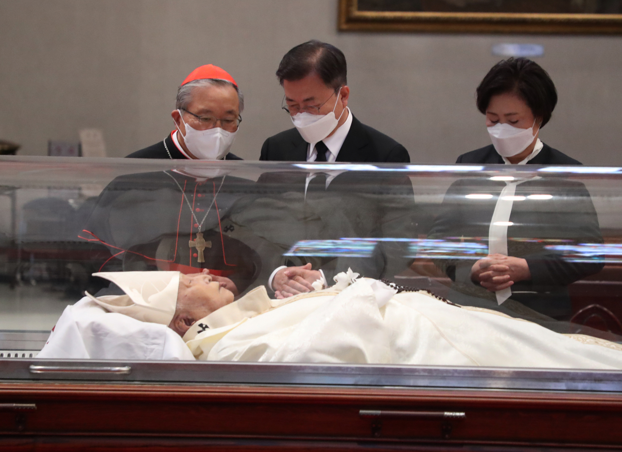 문 대통령 부부는 정 추기경이 안치된 투명 유리관앞에 나란히 섰다. 문 대통령 부부는 성호를 그은 뒤 눈을 감고 기도를 올렸다. 기도를 마친 문 대통령은 고개를 들어 유리관에 안치된 정 추기경을 바라봤다. 김 여사도 기도를 마쳤다. 문 대통령과 김 여사는 유리관 앞으로 한발 다가갔다.