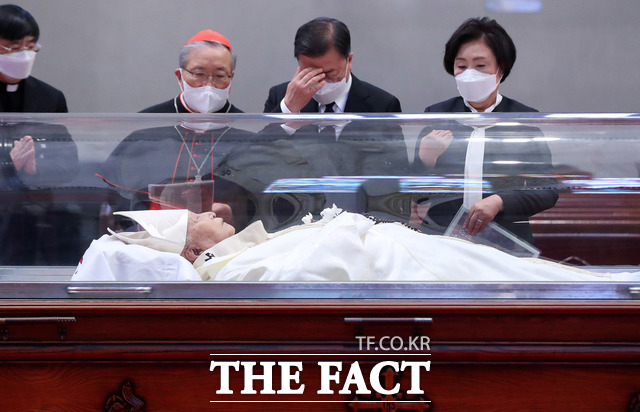 검은색 정장을 입고 명동대성당에 도착한 문 대통령 내외는 염수정 추기경의 영접을 받으면서 성전으로 입장해 대성당 제대 앞 투명 유리관에 안치된 정 추기경 옆에 나란히 서서 개별 기도를 했다.