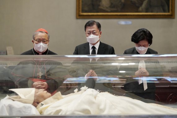 (서울=뉴스1) 유승관 기자 = 문재인 대통령과 김정숙 여사가 29일 서울 중구 명동성당에 마련된 고(故) 정진석 추기경의 빈소를 찾아 천주교 서울대교구장인 염수정 추기경의 안내를 받으며 조문하고 있다. 2021.4.29/뉴스1 /사진=뉴스1화상 |