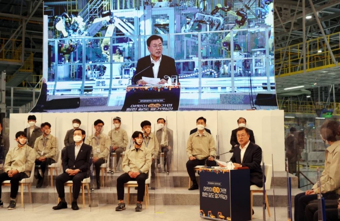[광주=뉴시스]추상철 기자 = 문재인 대통령이 29일 광주광역시 광산구 광주글로벌모터스 공장에서 열린 준공 기념행사에 참석해 발언하고 있다. 2021.04.29. scchoo@newsis.com |