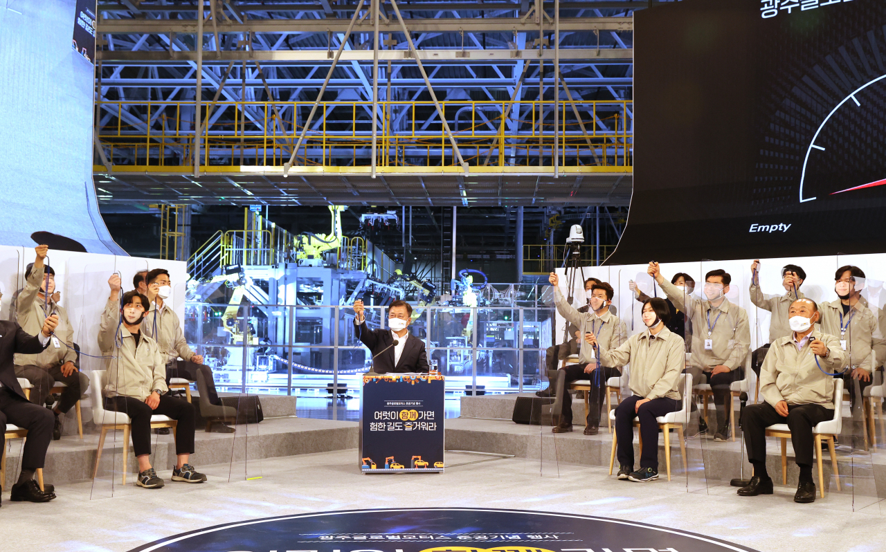 문 대통령은 "쉽지 않은 여정 끝에 마침내 첫 목적지에 도착했다"며 "상생의 약속을 지키기 위해 노사민정이 최선을 다해주신 결과"라고 했다. 이어 "현대차와 광주시가 함께 투자와 협력했다"며 "노동자들은 당당한 주체로서 사측과 상생협의회를 구성하고 생산성 높일 방안을 함께 고민했다"고 했다.