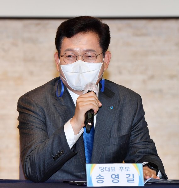 송영길 더불어민주당 당대표 후보가 지난 27일 서울 대방동 공군호텔에서 열린 더불어민주당 전국자치분권민주지도자회의(KDLC) 총회 및 민주당 당대표 후보 초청토론회에서 모두발언을 하고 있다. / 사진=뉴스1 |