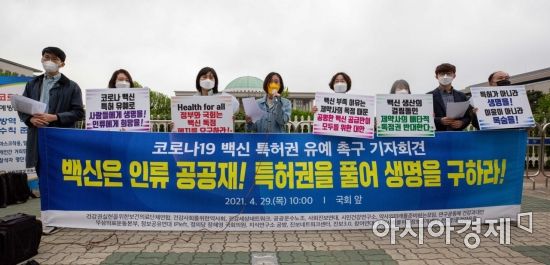 사진은 29일 서울 여의도 국회 앞에서 참여연대를 비롯한 시민단체 관계자들이 코로나19 백신 특허권 유예 촉구 기자회견을 하고 있는 모습. /강진형 기자aymsdream@ |