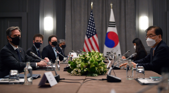 주요 7개국 외교·개발장관 회의에 참석 중인 정의용 외교부 장관(오른쪽)과 토니 블링컨 미국 국무장관(왼쪽)이 3일(현지시간) 영국 런던의 한 호텔에서 한·미 외교장관 회담을 하고 있다. 런던|AP연합뉴스 |