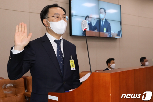 (서울=뉴스1) 이동해 기자 = 문승욱 산업통상자원부 장관 후보자가 4일 오전 서울 여의도 국회에서 열린 산업통상자원중소벤처기업위원회 인사청문회에서 선서를 하고 있다. 2021.5.4/뉴스1 |