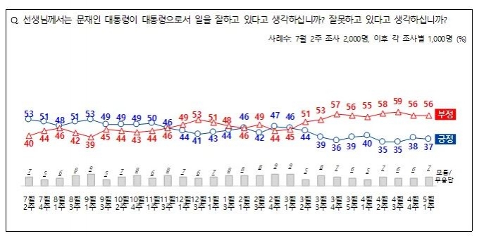 문재인 대통령의 국정운영 지지율이 37%로 전주대비 소폭 하락했다는 여론조사 결과가 6일 나왔다. 부정평가는 56%로 지난 3월 둘째주 이후 9주 연속 50%대를 유지했다.