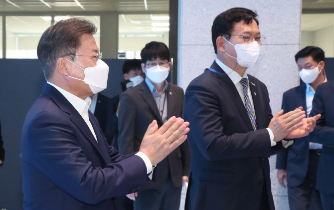 문재인 대통령이 6일 오후 울산광역시 남구 3D프린팅 지식산업센터에서 열린 ‘울산 부유식 해상풍력 전략 보고’에 더불어민주당 송영길 신임대표와 참석해 있다.(사진=연합뉴스) |