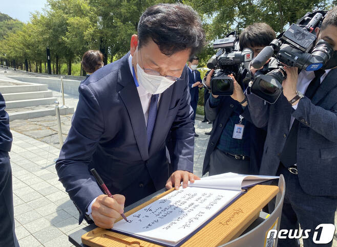 송영길 더불어민주당 대표가 6일 오전 경남 김해시 봉하마을 고 노무현 전 대통령 묘역을 찾아 참배를 마친 후 방명록을 작성하고 있다. 2021.5.6/뉴스1 (C) News1 여주연 기자 |