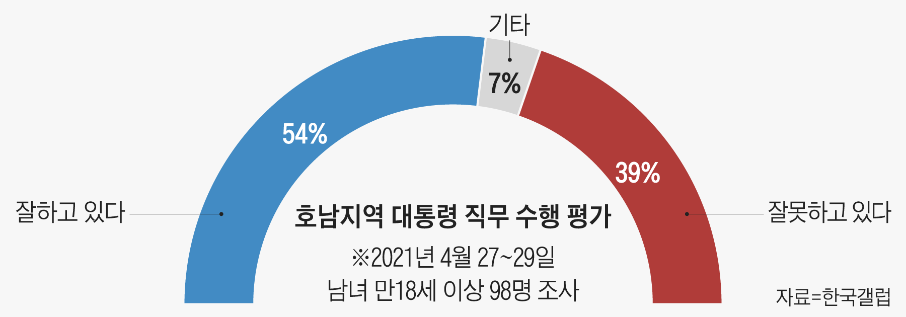 한국갤럽이 4월 27~29일 전국 18세 이상을 대상으로 한 여론조사(중앙선거여론조사심의위원회 홈페이지 참조)에서 광주(光州)·전라 지역의 대통령 국정 지지율은 54%였다. ‘잘못하고 있다’는 답은 39%였다. 현 정부 출범 때 90%대였던 지지율과 비교하면 상당한 차이가 난다. 이 같은 현상은 4·7 서울·부산시장 보궐선거 후 뚜렷해졌다. 선거 직전 60~70%대를 유지하던 호남의 문 대통령 국정 지지율은 4월 13~15일 같은 갤럽 조사에서 49%까지 떨어졌다. 지난 2일 더불어민주당 전당대회에서는 호남 유일 최고위원 후보였던 서삼석 의원이 탈락하기도 했다. 민주당 관계자는 “강성 친문들이 당 전면에 나서면서 호남이 소외감을 느끼는 측면도 있다”며 “이러다가 정권 재창출이 어려울 수도 있다는 위기감이 적지 않다”고 했다.