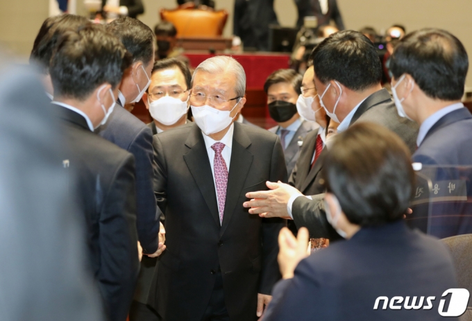 (서울=뉴스1) 신웅수 기자 = 김종인 국민의힘 비상대책위원장이 8일 오전 서울 여의도 국회에서 열린 의원총회를 마친 후 퇴장하고 있다. 2021.4.8/뉴스1 |