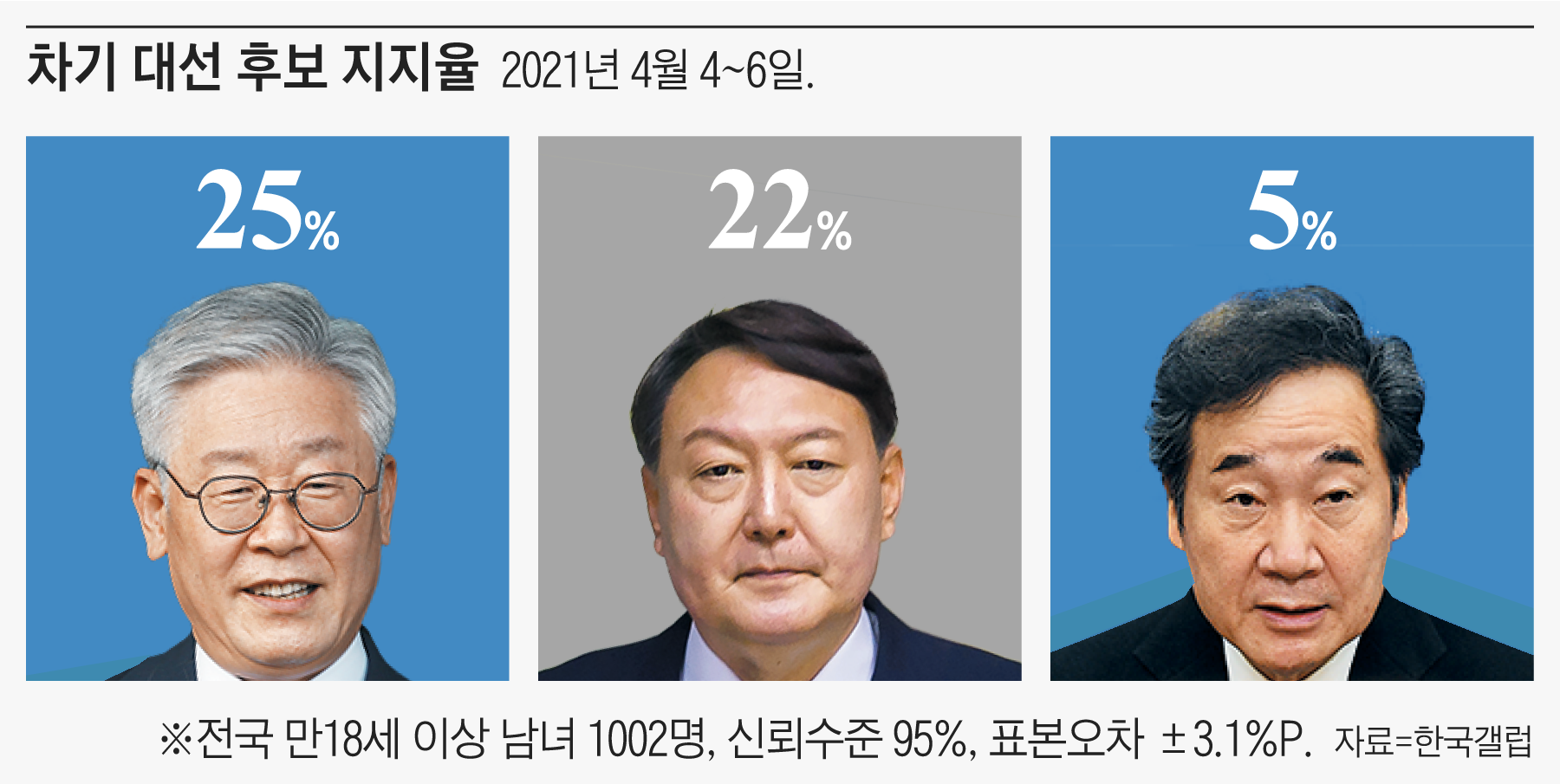 이재명 경기지사가 차기 대권주자 지지도에서 윤석열 전 검찰총장을 오차범위 내에서 앞선다는 여론조사 결과가 7일 나왔다. 한국갤럽 조사에 따르면 차기 정치 지도자 선호도에서 이 지사가 25%, 윤 전 총장이 22%로 집계됐다.