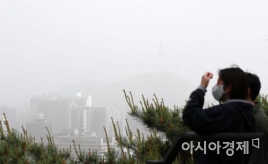 서울 등 10개 시도에 황사 위기경보 '관심' 단계가 발령된 7일 서울 인왕산에서 바라본 도심이 뿌옇다. 황사 위기경보 '관심' 단계는 우리나라에 영향을 끼칠 가능성이 있는 황사가 발생하고 황사로 인한 미세먼지(PM10)가 '매우 나쁨'(일평균 PM10 150㎍/㎥ 초과) 수준일 때 발령된다./김현민 기자 kimhyun81@ |