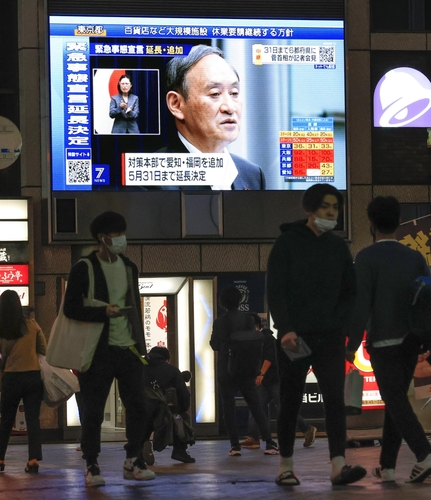 (오사카 교도=연합뉴스) 일본 오사카(大阪)시 번화가에 설치돼 있는 대형 TV에 긴급사태 연장 결정과 관련해 기자회견을 하는 스가 요시히데 총리가 비치고 있다. |