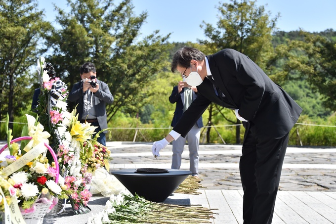 박형준 부산시장이 9일 보수진영 부산시장으로는 처음으로 고 노무현 전 대통령의 생가와 묘소가 있는 김해 진영읍 봉하마을을 찾아 참배하고 있다. 부산시 제공 |