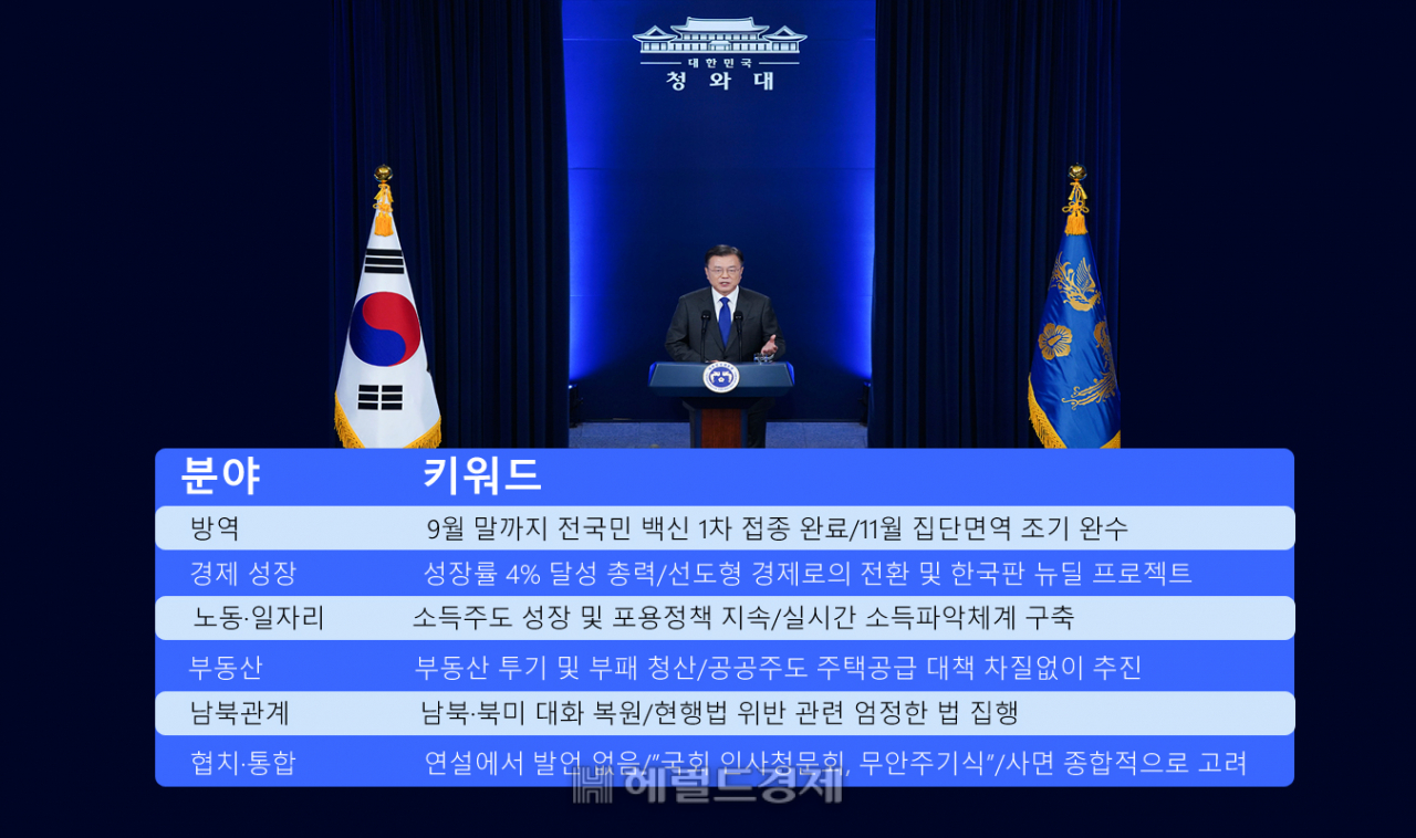 '코로나'는 총 26번, '백신'은 13번 언급했다. 문 대통령은 연설을 통해 올 9월 말까지 전 국민을 대상으로 1차 접종을 완료하고 11월 집단면역 달성 목표를 조기완수하겠다고 했다.