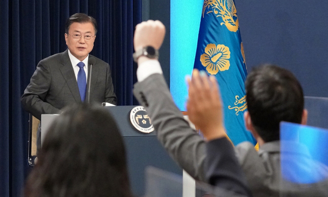 문재인 대통령이 10일 오전 청와대 춘추관에서 취임 4주년 특별연설을 마친후 질문을 위해 손을 든 기자를 지명하고 있다.뉴스1 |