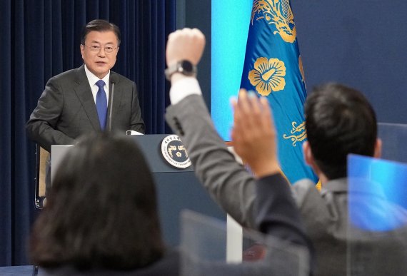 문재인 대통령이 10일 오전 청와대 춘추관에서 취임 4주년 특별연설을 마친후 질문을 위해 손을 든 기자를 지명하고 있다. 사진=뉴스1. |