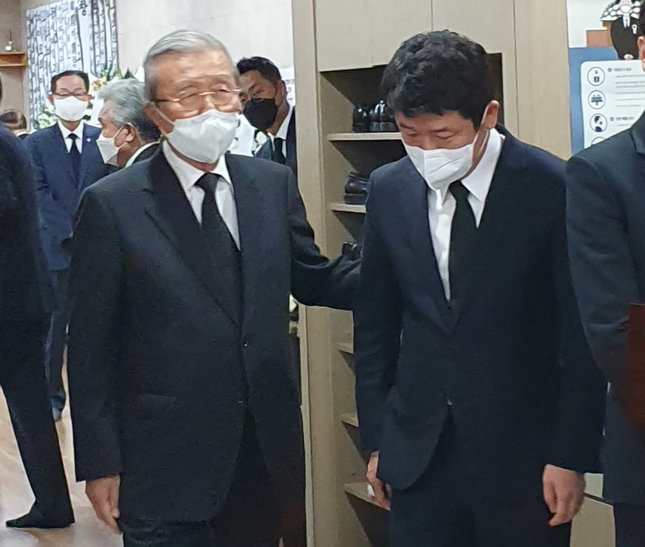 국민의힘 김종인 전 비상대책위원장(왼쪽)이 10일 서울 광진구 건국대학교병원 장례식장에 마련된 고 이한동 전 국무총리 빈소를 찾아 조문하고 나오며 유의동 의원과 대화하고 있다. [연합] |
