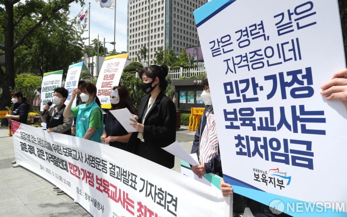 [서울=뉴스핌] 김학선 기자 = 공공운수노조 보육지부가 11일 서울 종로구 정부서울청사 앞에서 '임금차별 없는 어린이집을 위한 보육교사 서명운동 결과발표 기자회견'을 하고 있다. 2021.05.11 yooksa@newspim.com