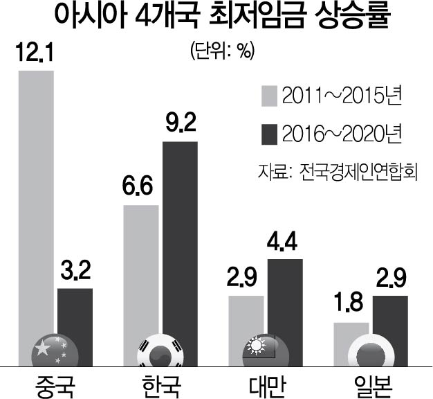 이 같은 가파른 최저임금 인상은 노동생산성 향상 속도보다 빠르다는 점에서 경영계의 우려를 낳고 있다. 2010~2019년 물가 상승률을 감안한 실질 최저임금 증가율과 노동생산성 증가율 간 격차가 우리나라는 3.3%포인트였는데 이는 전체 18개국 가운데 베트남(6.2%포인트), 라오스(4.5%포인트) 등에 이어 다섯 번째로 높은 수준이다. 최저임금 상승률과 노동생산성 증가율 간 격차가 클수록 임금 증가가 생산성 개선 속도보다 빠르다는 의미다. 일본은 이 격차가 0.5%포인트, 대만은 1.6%포인트다.