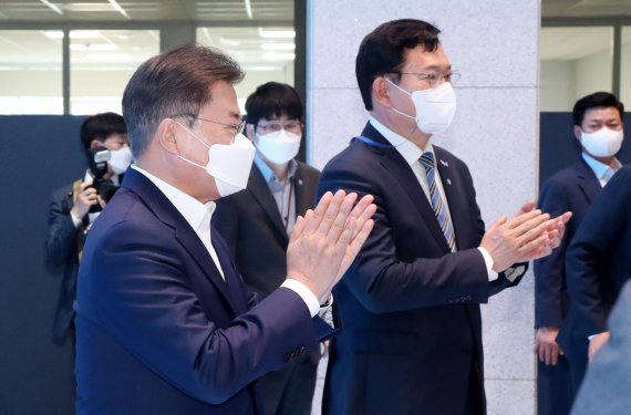 문재인 대통령이 6일 오후 울산광역시 남구 3D프린팅 지식산업센터에서 열린 ‘울산 부유식 해상풍력 전략 보고’를 마친후 송영길 더불어민주당 대표와 함께 박수를 치고 있다. 사진=뉴시스화상 |