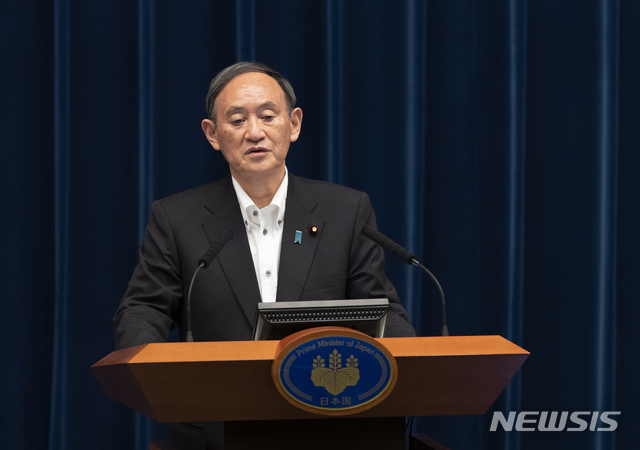 [도쿄=AP/뉴시스]스가 요시히데 일본 총리가 지난 7일 도쿄에서 열린 기자회견에서 발언하고 있다. 2021.05.12. |