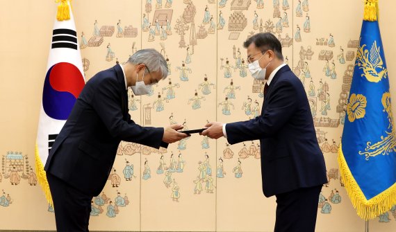 [서울=뉴시스]추상철 기자 = 문재인 대통령이 12일 오전 청와대에서 천대엽 신임 대법관에게 임명장을 수여하고 있다. 2021.05.12. scchoo@newsis.com <저작권자ⓒ 공감언론 뉴시스통신사. 무단전재-재배포 금지.> /사진=뉴시스화상 |