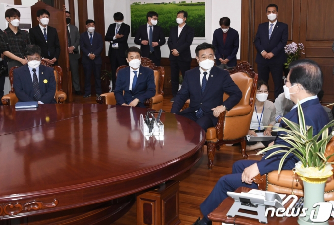 (서울=뉴스1) 오대일 기자 = 윤호중 더불어민주당 원내대표가 13일 오전 서울 여의도 국회의장실을 방문해 박병석 의장에게 김부겸 국무총리 후보자 인사청문회 인준안 처리를 위한 본회의 개의를 요청하고 있다. 2021.5.13/뉴스1 |