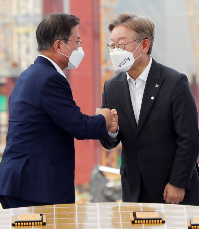 차기 대선 300일 앞두고 문재인 대통령과 이재명 경기지사가 한 자리에 만났다. 문재인 대통령의 '케이(K)-반도체 전략' 행보에 이 지사가 함께 하며 보조를 맞췄다. 현직 대통령과 차기대선 지지율 선두주자가 만난 것으로 여권 지지층의 기대감을 한층 끌어올렸다는 목소리가 나온다.