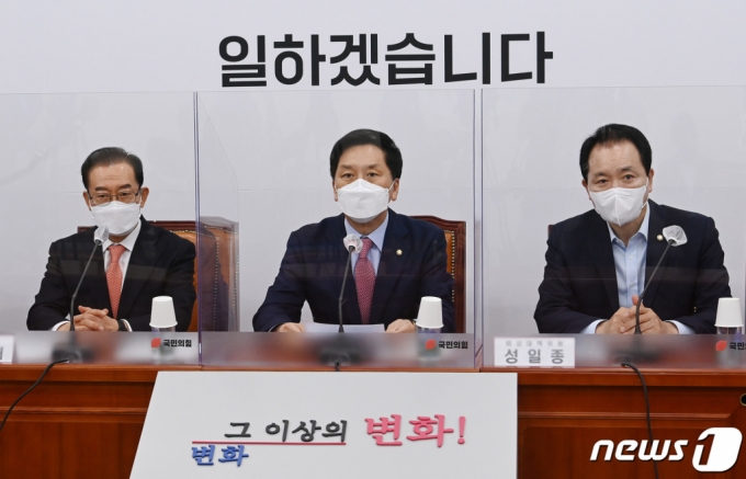 (서울=뉴스1) 이동해 기자 = 김기현 국민의힘 당 대표 권한대행 겸 원내대표(가운데)가 13일 오전 국회에서 열린 비상대책위원회의에서 모두발언을 하고 있다. 2021.5.13/뉴스1 |