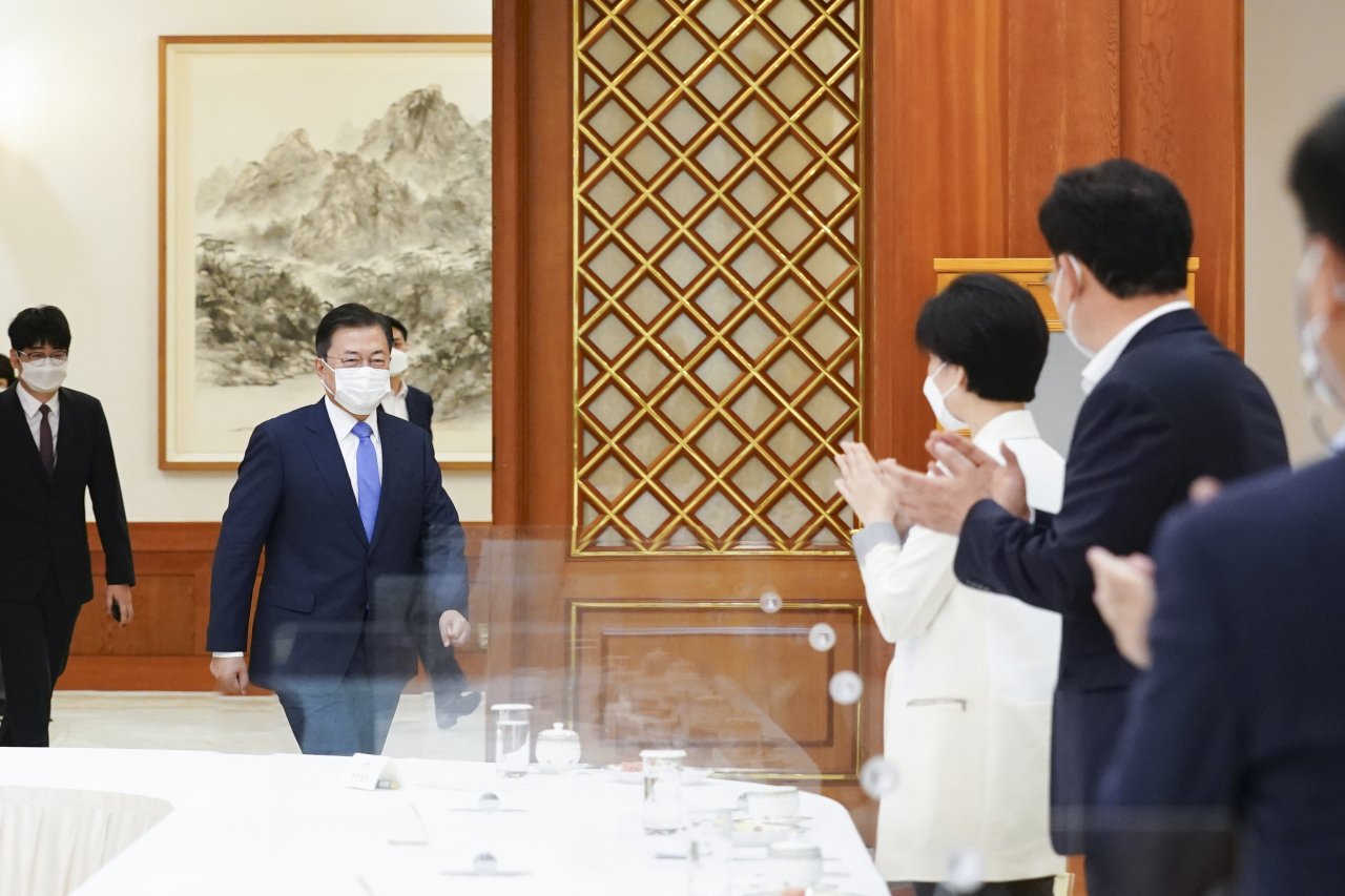 문재인 대통령이 14일 오전 청와대에서 열린 더불어민주당 지도부 초청 간담회에 참석하고 있다. [연합] |