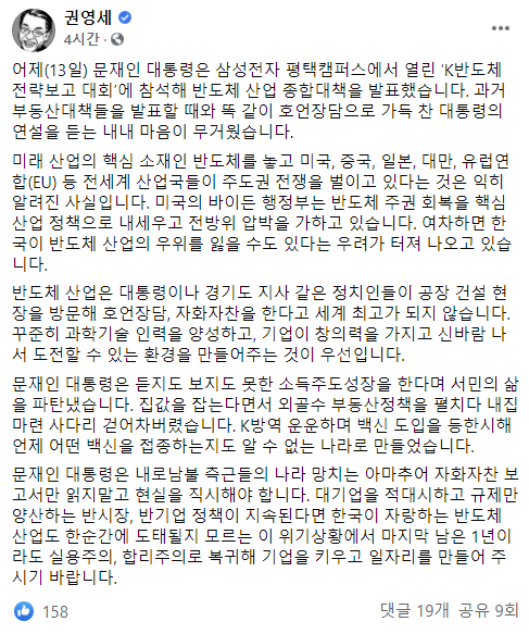 권 의원은 "기업을 적대시하고 규제만 양산하는 반시장, 반기업 정책이 지속된다면 한국이 자랑하는 반도체 산업도 한순간에 도태될지 모르는 이 위기상황에서 마지막 남은 1년이라도 실용주의, 합리주의로 복귀해 기업을 키우고 일자리를 만들어 주기 바란다"고 당부했다.