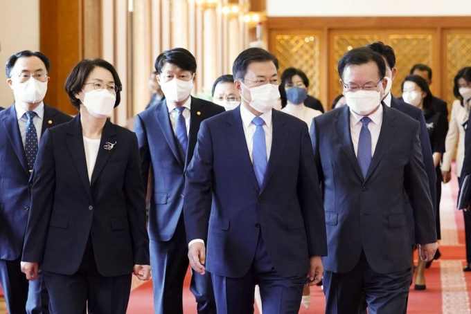 [서울=뉴시스]박영태 기자 = 문재인 대통령이 14일 오전 청와대에서 김부겸 국무총리 및 국무위원에게 임명장을 수여한 후 환담장으로 함께 이동하고 있다. 앞줄 왼쪽부터 임혜숙 과기정보통신부 장관, 문재인 대통령, 김부겸 국무총리. 뒷줄 왼쪽부터 문승욱 산업통상자원부 장관, 안경덕 고용노동부 장관, 노형욱 국토교통부 장관. 2021.05.14. since1999@newsis.com |