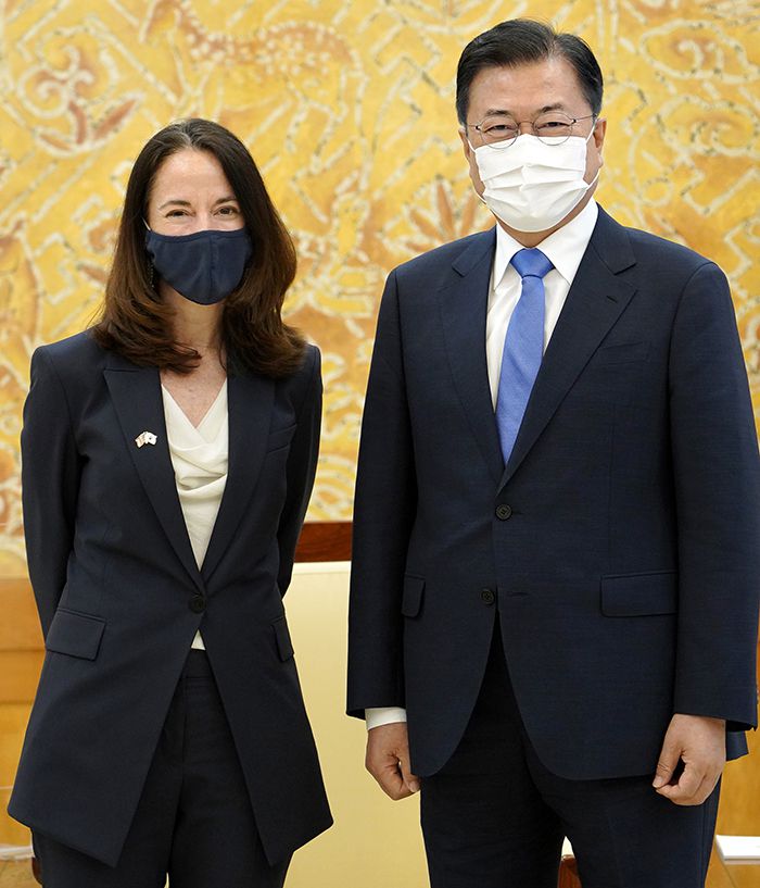 문 대통령은 이날 “헤인스 국장은 미국 최초의 여성 국가정보장이자, 바이든 정부 출범 후 상원에서 가장 먼저 인준된 분”이라며 덕담을 건넸다. 이에 헤인스 국장은 “문 대통령이 인권과 평화를 위해 걸어온 길에 존경을 표한다”며 “한미 동맹은 안보 동맹 이상의 가치를 지닌다”고 했다.