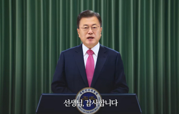 문 대통령은 이날 영상축사에서 “코로나 상황 속에서 아이들을 위해 선생님들이 더 많은 땀을 흘렸다”며 “원격 수업부터 더욱 안전한 학교를 만드는 일까지, 선생님들의 헌신 덕분에 아이들은 친구들과 함께 교실에서 봄을 맞이할 수 있었다”고 말했다.