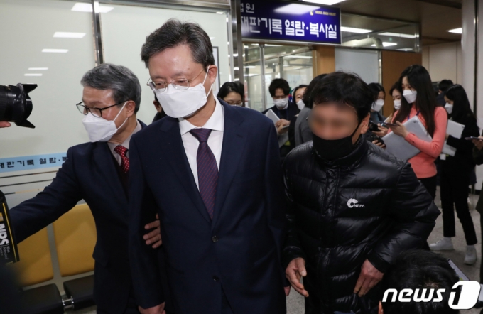 (서울=뉴스1) 박정호 기자 = 우병우 전 청와대 민정수석이 4일 오후 서초동 서울고등법원에서 열린 국회에서의증언·감정등에관한법률위반 등 항소심 선고공판에서 징역 1년을 선고 받은 후 법정을 나와 취재진과 인터뷰 후 이동하고 있다. 재판부는 우 전 수석이 1심에서 1년간 구금생활을 한 점을 감안해, 법정구속하지는 않았다. 2021.2.4/뉴스1 |