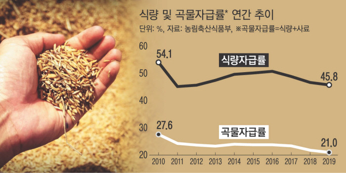 18일 농림축산식품부와 국회 입법조사처 자료를 보면 한국의 식량자급률은 1980년 69.6%에서 2019년 45.8%로 40년간 23.8%포인트 감소했다. 이 가운데 양곡 식량자급률은 2010년 54.1%에서 2019년 47.7%로 10년간 6.4%포인트나 떨어졌다.